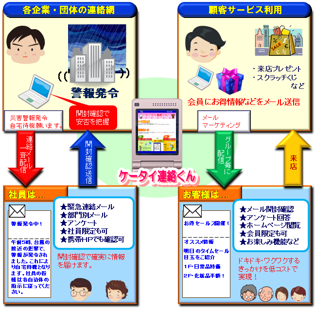 ケータイ連絡くんにより、社員向け緊急連絡網・安否確認はもちろん、お客様・会員様向けのメールマーケティングもコストパフォーマンス抜群です!