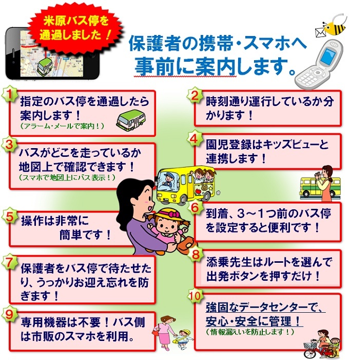 - 「バスウォッチ」は、保護者をバス停で待たせたり、うっかりお迎え忘れを防止します。